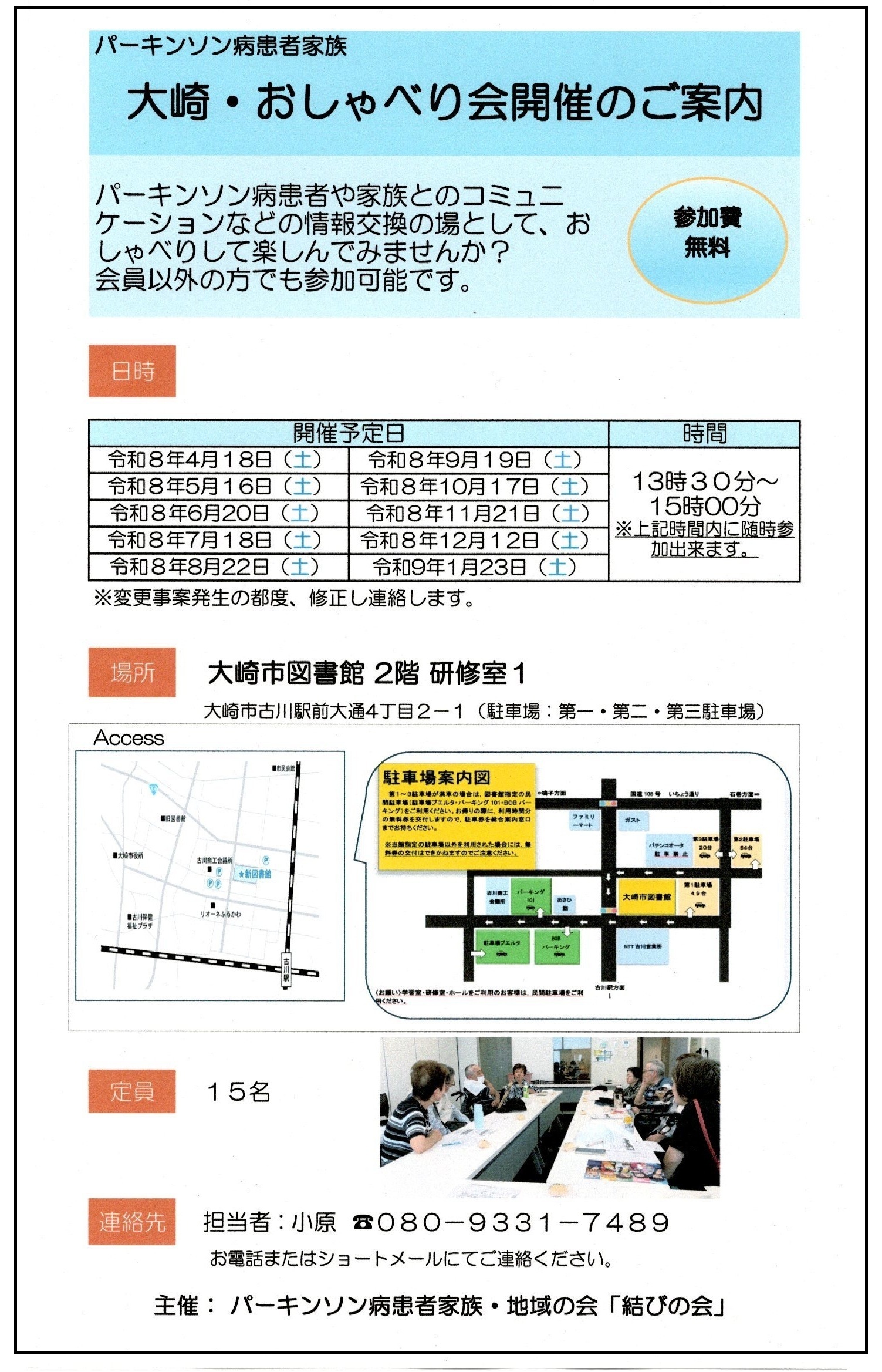 「結びの会」は、宮城県大崎市古川を中心に県内に住むパーキンソン病患者・ご家族が、この病気に対して1人で悩むことのないように、